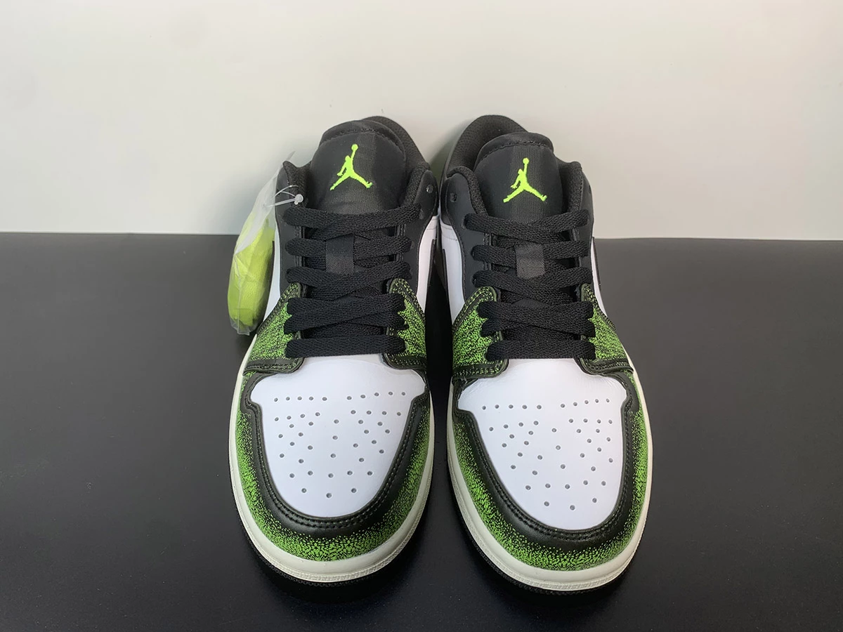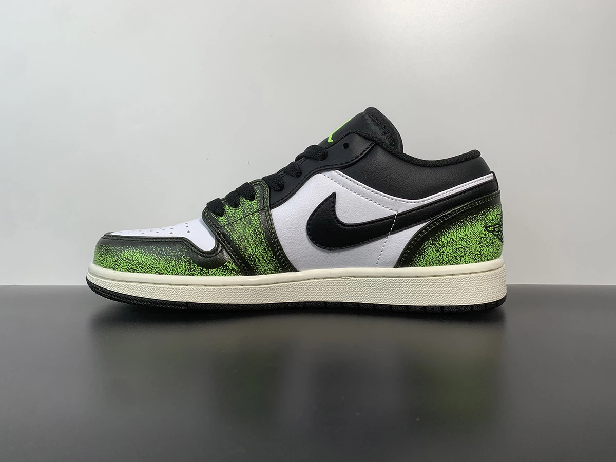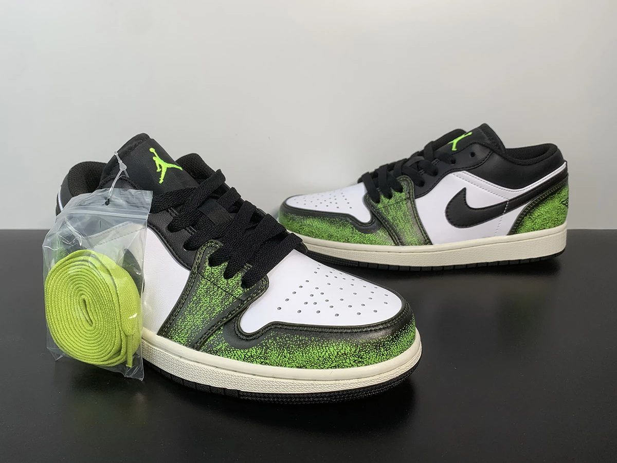 We recently showed you a brand newย Air Jordan 1 Midย that presented the classic black, red, and white in an artistic presentation. The famed wear-away look graced the upper, with the black paint scrubbed away to partially revealed a bright red layer underneath. Now, the same style has appeared on anย Air Jordan 1 Low, but with a refreshing bright green.